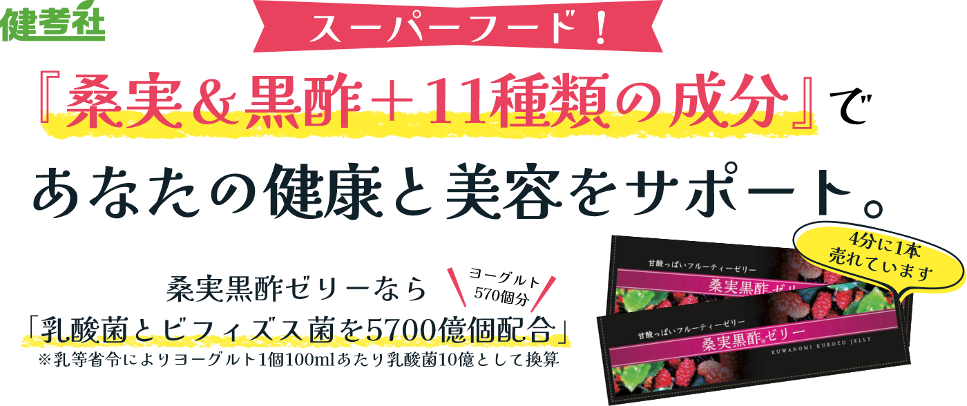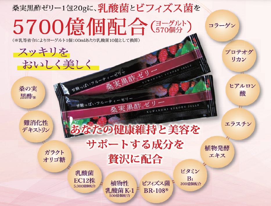 乳酸菌EC12株が、桑実黒酢ゼリー1本(20g)に5000億個(ヨーグルトの500L分に該当)も配合されています。
